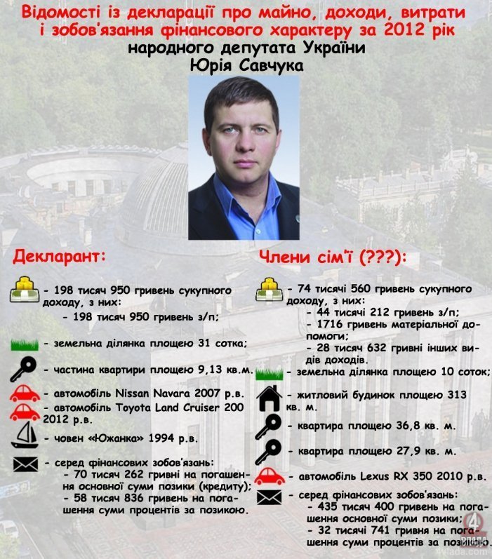 У 2011 році Юрій Савчук заробив 28 тисяч 915 гривень. Тоді у обранця було на одного автомобіля менше, а члени сім’ї мали квартиру лише площею 36,8 кв. м.