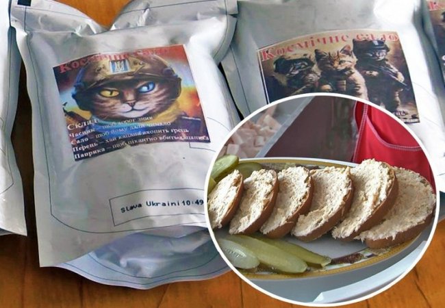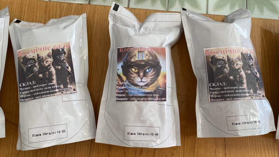 "Космічним" сало назвали волонтери, говорить Олена Кічук, через вигляд готових пакунків. На етикетці зобразили бойових котиків у військовому спорядженні.