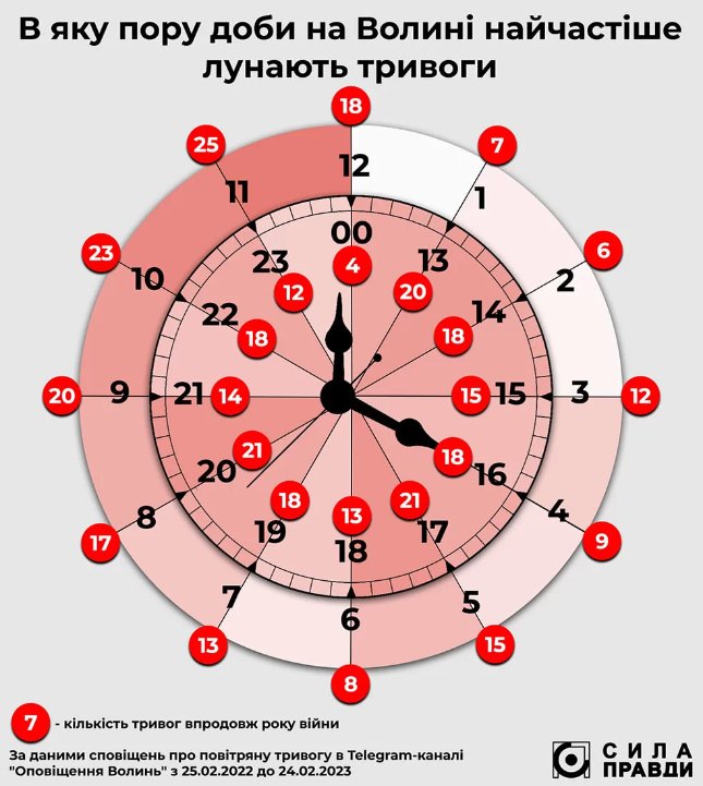 Якщо подивитися на частоту тривог впродовж доби, то найчастіше агресор створює загрозу для заходу України вранці та увечері: між 8-ю і 11 годинами ранку та після 19-ї. Найрідше – між 24-ю та 3-ю годиною ночі.