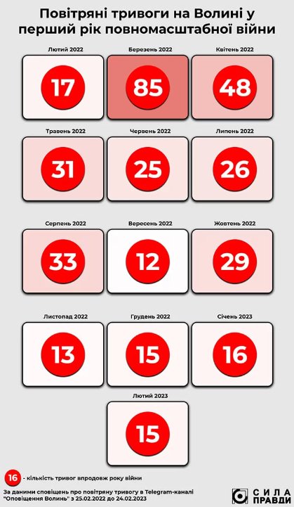 За даними Telegram-каналу «Оповіщення Волинь», в якому інформують про повітряну тривогу в регіоні, з 25 лютого 2022 року до 24 лютого 2023 року волиняни мали спускатися в укриття 365 разів. В середньому – майже раз на добу. Однак, інтенсивність атак ворога ракетами, загрози з повітря, а відповідно і кількість повітряних тривог, впродовж року була нерівномірна. Наприклад, у перший місяць тривоги лунали в середньому майже тричі на добу, впродовж другого місяця – двічі на добу, далі інтенсивність поволі зменшувалася.