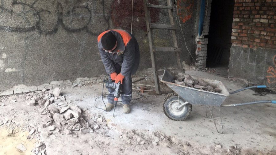 "Демонтаж підлоги, стяжки, штукатурки, старих перегородок, віконних та дверних прорізів, опалення, каналізації – повністю демонтаж старих комунікацій. Основні зараз роботи – розпланування приміщень, мурування перегородок, замуровування прорізів", – розповів виконроб.