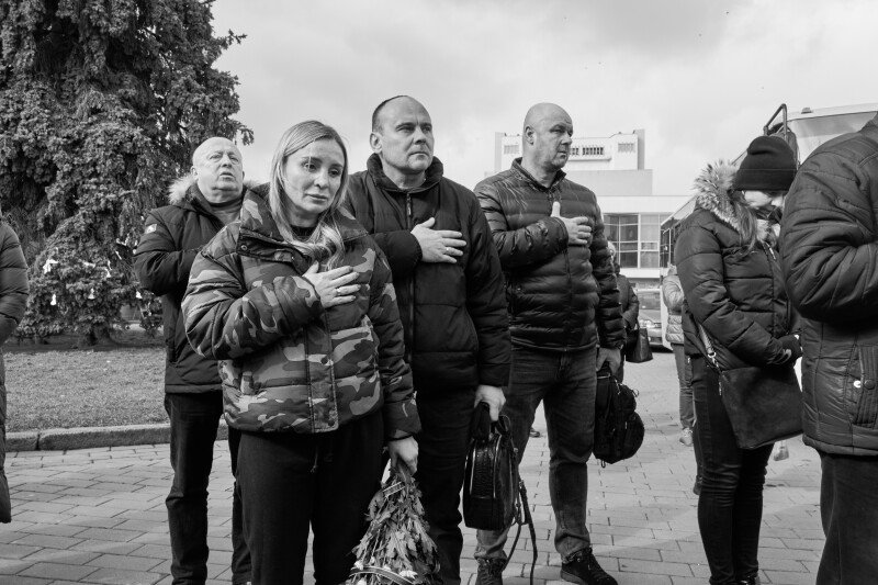 По завершенню богослужіння домовину з тілом Героя під звуки дзвонів і солдатської сурми пронесли Театральним майданом. Біля фотостенду “Герої Небесної Сотні – Загинули за єдність України” скорботна процесія зупинилася і виконала Державний Гімн.