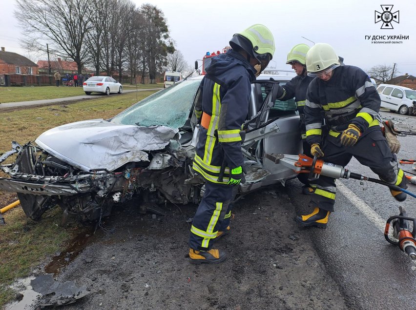 Травмованих громадян госпіталізували медики, а тіло загиблого водія вилучили бійці 3 ДПРЧ м. Рожища: за допомогою гідравлічного інструмента вони розрізали деформовані елементи автомобіля, аби деблокувати загиблого.