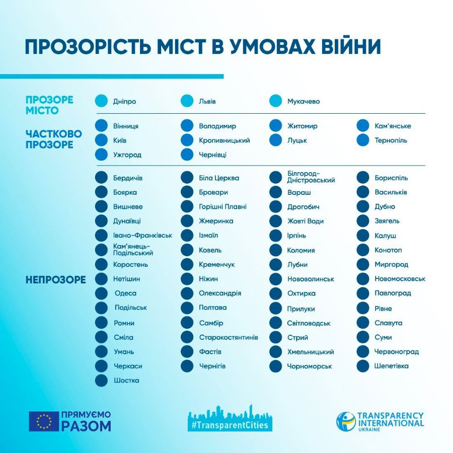 «Частково прозорими» визначили міськради 10 міст: Вінниці, Володимира, Житомира, Кам’янського, Києва, Кропивницького, Луцька, Тернополя, Ужгорода та Чернівців.
