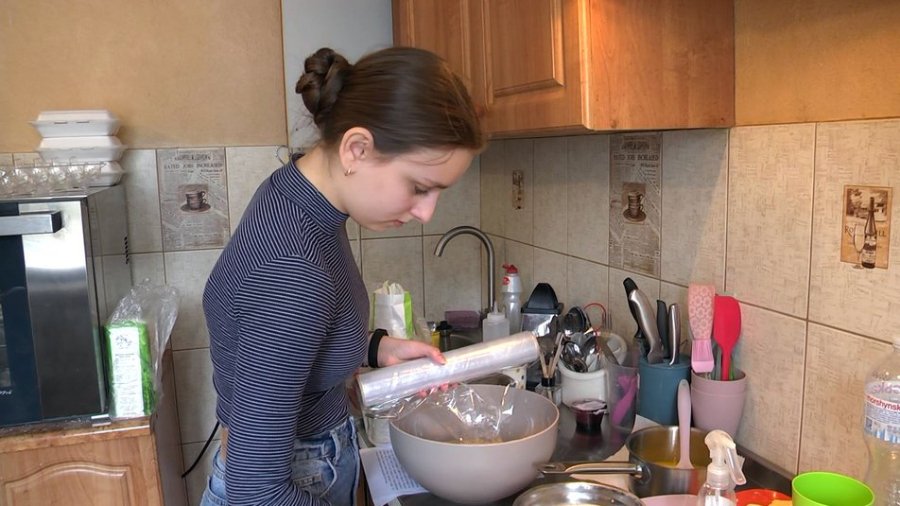 Катерина Куриця пече паски вперше. Каже, що цього разу процеси розділені не рівномірно, усі роблять, те, що кому перепадає. Завдання дівчини – це дріжджі та яйця: розбивати, збивати та зважувати.