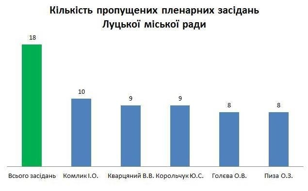 Так, найбільше «прогуляли» (понад 50% пленарних засідань) три міські обранці: Ірина Комлик (Партія регіонів), Віталій Кварцяний (позафракційний) та Юрій Корольчук (ВО «Батьківщина»). Близькі до цього показника також депутати Олена Голєва (Європейська партія України) та Олександр Пиза (позафракційний).