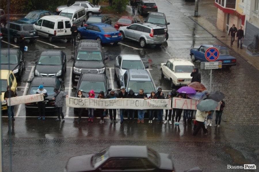 Біля приміщення мерії на Богдана Хмельницького обранців громади зустрічали вкладники «Західінкомбанку». Люди вимагають, аби фінансова установа віддала їм їхні гроші. Мітингу не завадив дощ, втім згодом люди перейшли до приміщення міської ради.