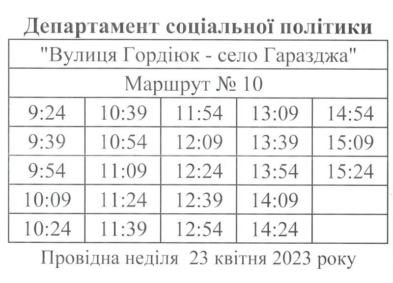 Час відправлення із зупинок “Вулиця Гордіюк”, “Департамент соціальної політики”, “с.Гаразджа (кладовище)” додається.
