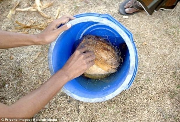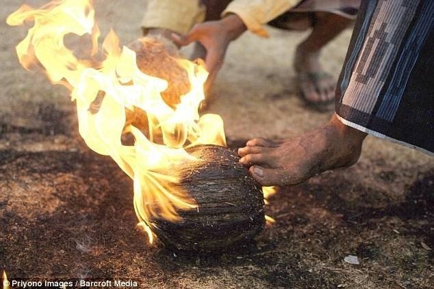 Замість м'яча у хлопців - палаючий кокосовий горіх, який попередньо вимочується в керосиніі протягом двох днів, завдяки чому матч триває цілих 60 хвилин.