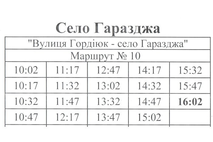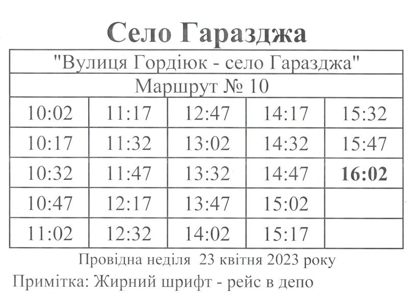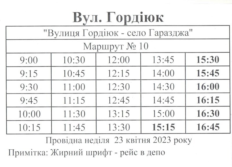 Час відправлення з зупинок “Вулиця Гордіюк”, “Департамент соціальної політики”, “с.Гаразджа (кладовище)” додається.
