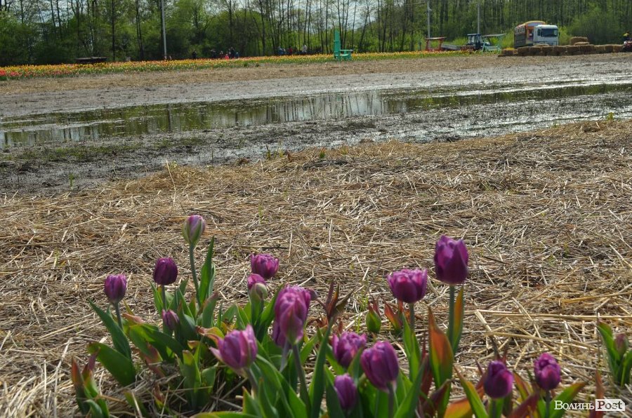 Ідемо полем далі. Помітивши вкотре калюжу, вирішуємо з’ясувати, скільки ж квітів втратила «Волинська Голландія» через паводок.