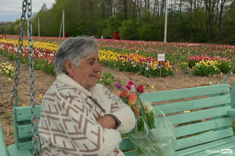 Жінка приїхала сюди з Горохова, щоби відпочити від метушні і гнітючої атмосфери, а заодно ще й цибулини квітів придбала. Піоновидні тюльпани, ділиться, полюбились найбільше.