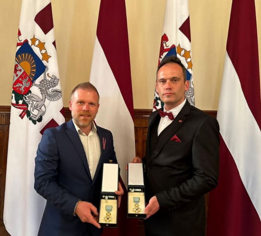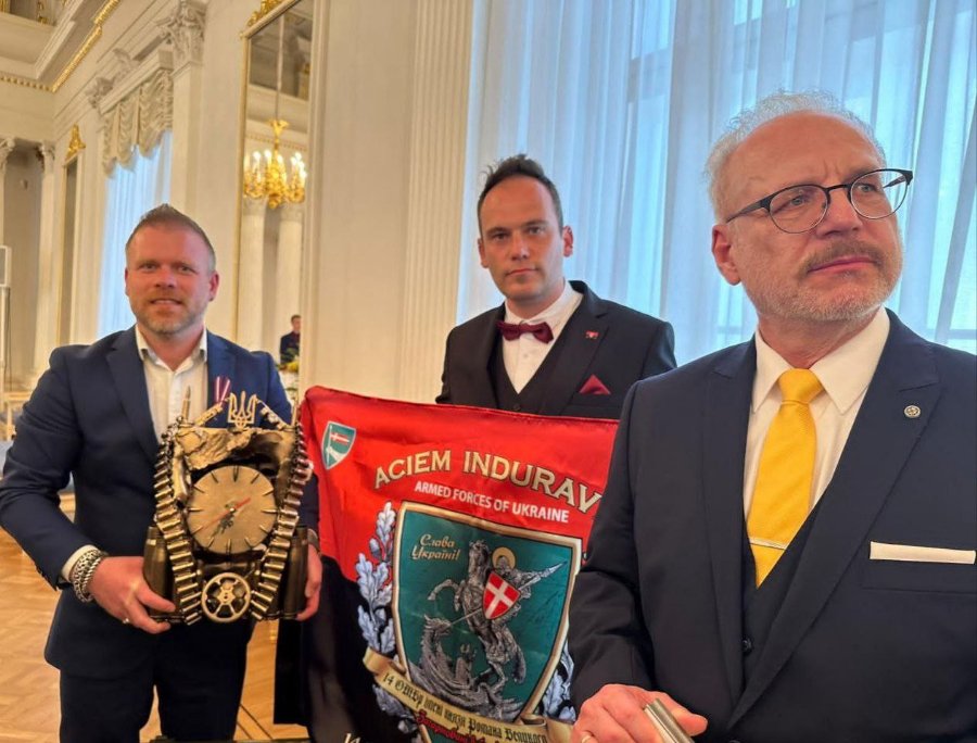 Прапор, сувеніри та подяки від воїнів нашої Князівської бригади латвійські волонтери Артурс Крістлібс та Айгарс Лосс передали главі Латвії у Ризькому замку, де президент Латвійської Республіки вручив їм державні нагороди за постійну підтримку України.