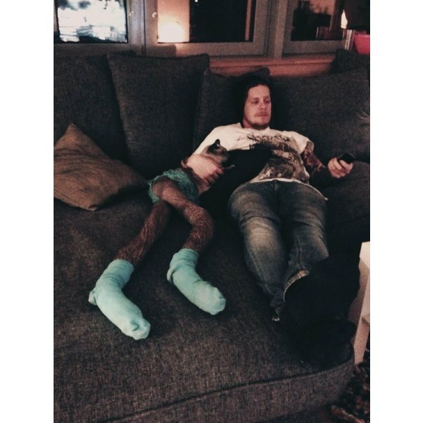 У підсумку виходить, ніби кіт лежить із довгими лапами. При цьому «довгі ноги» їм нібито взагалі не заважають. Тварини спокійно сплять.