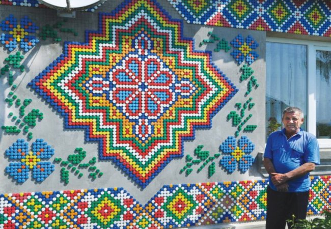 «Збирати пластикові кришки від пляшок я почав ще близько десяти років тому. Не знав, для чого це роблю, просто складавав у мішки й зберігав. Аж поки на очі не потрапила газетна публікація, героєм якої був чоловік, котрий прикрасив подібним чином будинок, тож і собі вирішив втілити таку ідею. Дружина підтримала, хоч спочатку мала інше бачення зовнішнього вигляду нашої домівки», – пригадує майстер.