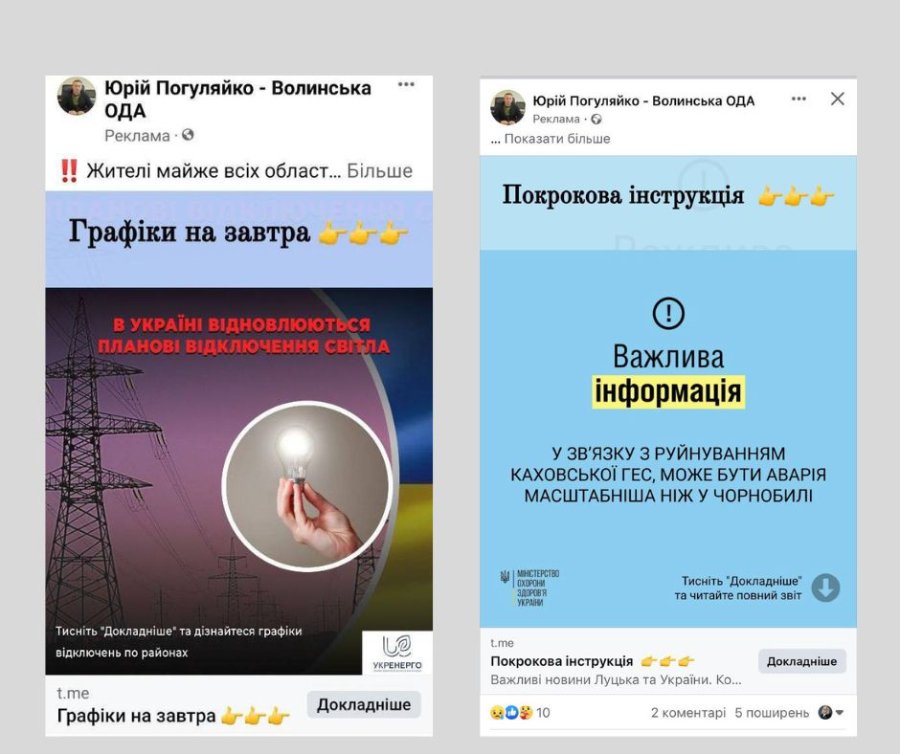 Усі ці дописи – неправдиві або ж маніпулятивні й стосуються тригерних (тобто тих, які чіпляють) і актуальних для українців тем – повісток, відключення світла, виплат, Каховської ГЕС. Більше того, усі ці неправдиві дописи містять посилання на телеграм-канали, на які нібито «треба» підписатися, аби про щось дізнатися, отримати покрокову інструкцію про те, як отримати допомогу, побачити графіки відключень світла тощо.