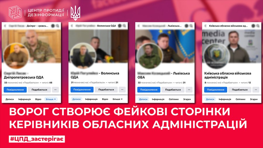 Як повідомляє Центр протидії дезінформації (ресурс Ради національної безпеки і оборони України), вдалося виявити масштабну кампанію зі створення фейкових сторінок голів обласних і військових державних адміністрацій та наповнення їх фейковою інформацією. У ЦПД впевнені, що це – не просто «розкрутка» таким чином телеграм-каналів, у цьому вбачають діяльність ворога – росії.