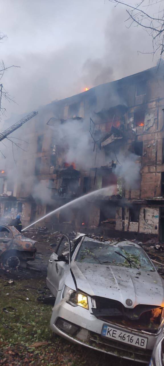 "Трагічна ніч. Удар по Кривому Рогу. Три крилаті ракети збило ПвК «Схід». Але маємо і «прильоти». Пошкоджені цивільні об’єкти. Понівечена п’ятиповерхівка. Попередньо, загинули троє її мешканців. 25 людей поранені, з них 19 – у лікарні. Горять квартири з першого по п’ятий поверхи. Вогонь охопив 700 кв м. Його приборкують рятувальники. Троє постраждалих – на приватному підприємстві. Їх госпіталізували. Ймовірно, під завалами потрощеного складу є люди. Їх шукають рятувальники. Побиті 6 легкових машин. Ще 4 травмованих – на іншій локації. Там горіли будівля та авто. Пожежу вже загасили. Побите і автомобільне підприємство. Зайнялася вантажна техніка. Полум’я вже вгамували. Зруйнована господарська споруда", - йдеться в повідомленні.