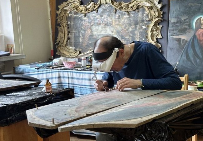 Відновлює ікону Христа Пантократора художник-реставратор з Харківської філії національного науково-дослідного реставраційного центру України Артем Погрібний.