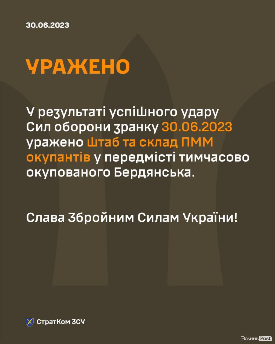 «У результат успішного удару Сил оборони зранку 30.06.2023 уражено штаб та склад ПММ окупантів у передмісті тимчасово окупованого Бердянська», – йдеться у повідомленні.