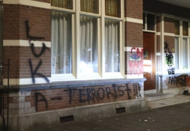Як повідомляє кореспондент Укрінформу в Гаазі, вікна в будівлі розбиті, на стінах - червоно-чорні графіті, зокрема “Лука-терорист”.
