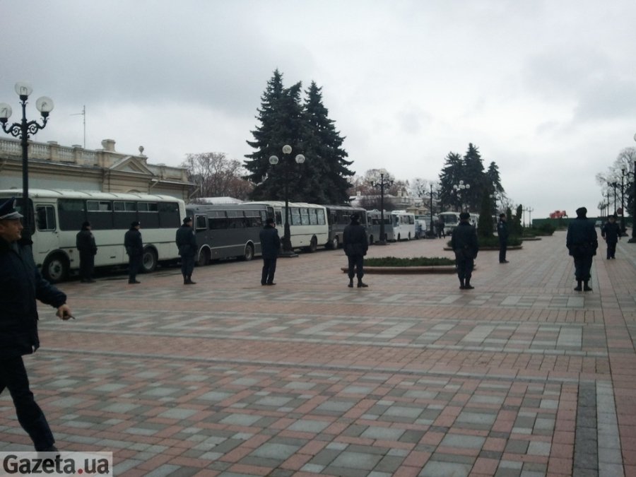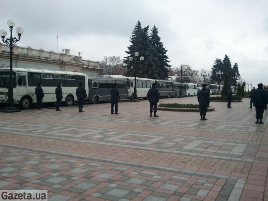 Перед будівлею Верховної Ради, де мають відбутися мітинги опозиції на підтримку законопроектів про лікування екс-прем'єра Юлії Тимошенко та євроінтеграції України, вже стоять кілька автобусів з Беркутом, - пише Українська правда.