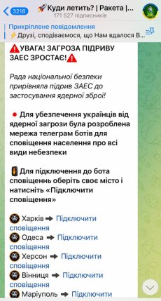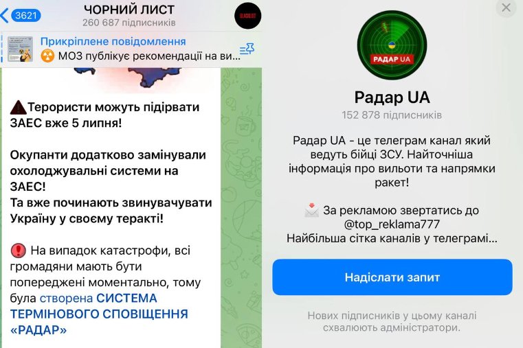 Низькопробні телеграм-канали продовжують спекулювати на темі війни. Цього разу читачам пропонують підключити нібито систему термінового сповіщення «Радар», який моментально сповістить у випадку вибуху на Запорізькій АЕС.