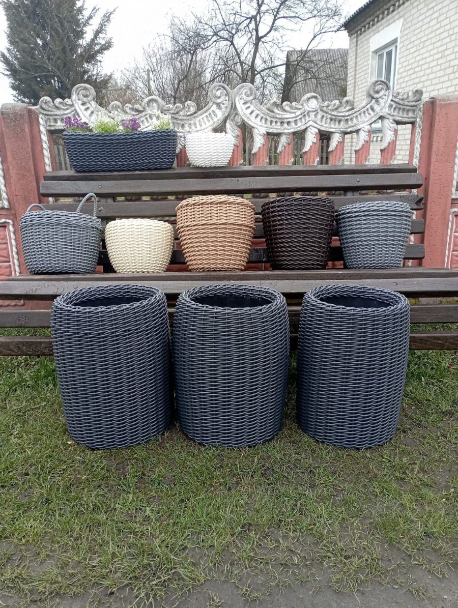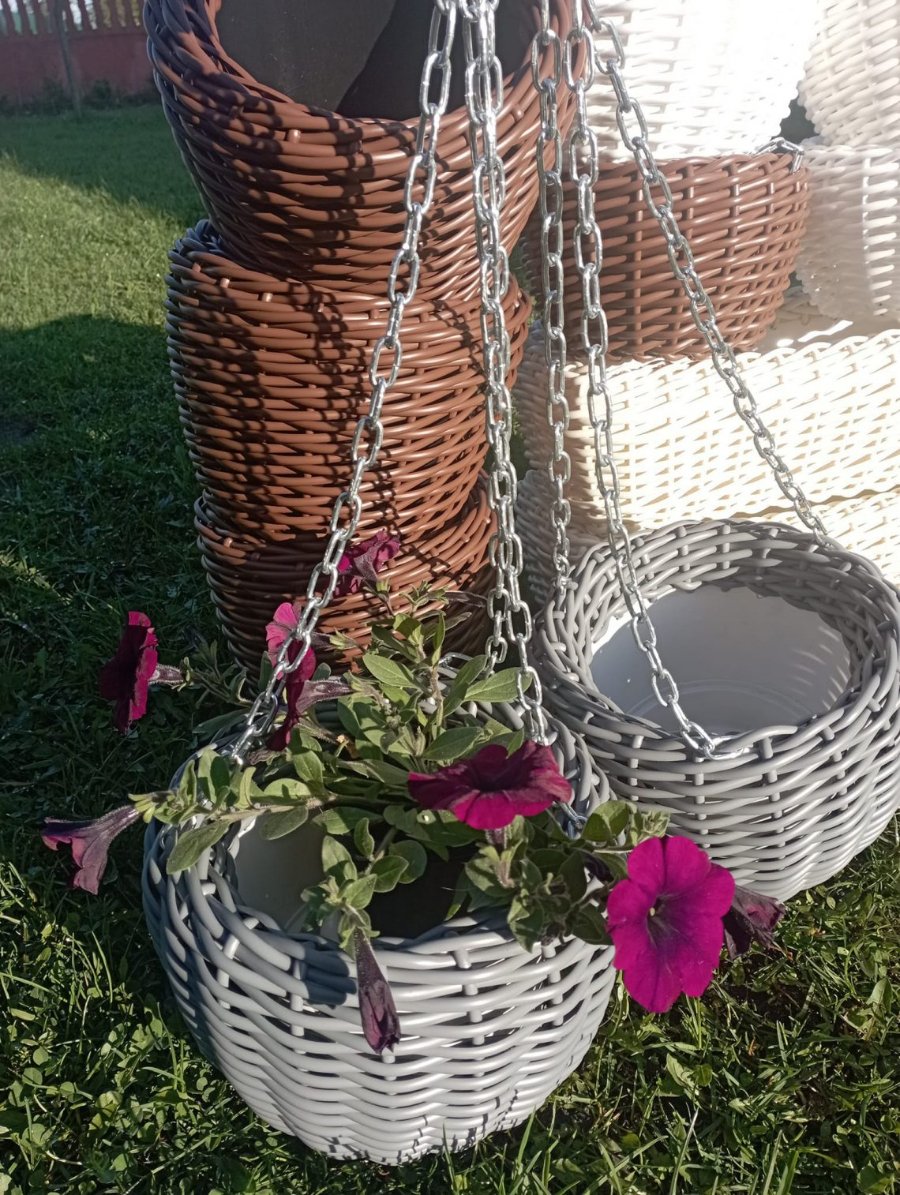 «Матеріал (штучний ротан) купую, узгоджую із замовницями колір та форму. Основу ж виробу становить чи сам підвазонник, чи відро, якщо кашпо – велике. Ото недавно робила на 12 літрів, то там уже треба було кілька відер скручувати, в таких випадках мені чоловік допомагає. Їх робити найскладніше», – ділиться тонкощами виготовлення Ольга Капець.