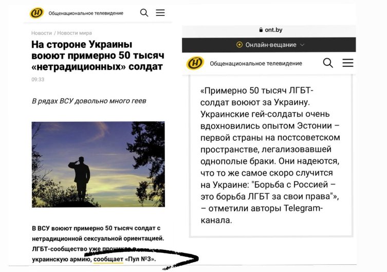 Одне із завдань білоруської пропаганди – дискредитувати Збройні сили України. Як показують результати масштабного дослідження ЛГТБ-дезінформації у проросійських пабліках, проведеного командою «Детектора медіа», «проросійські користувачі стверджували, що українські військові нібито зазнають поразок якраз через наявність в армії ЛГБТ-людей». Звісно, тут варто враховувати, що й поняття «поразка» та «перемога» у новомові росіян мають геть інші значення.