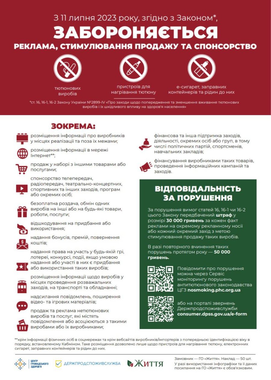 Порушення вимог закону каратимуться штрафом 30 тисяч гривень за кожен факт реклами на окремому рекламному носії або кожний окремий захід з метою стимулювання продажу. У разі повторного порушення протягом року — штраф сягатиме 50 тисяч гривень. Щодо продажу ароматизованих сигарет або рідин до е-сигарет зі смаками, то через рік штраф за це становитиме 20 тисяч гривень. Контроль щодо дотримання заборони реклами та правил маркування тютюнових виробів покладено на Держпродспоживслужбу. Повідомити про порушення може кожен за допомогою електронної форми.