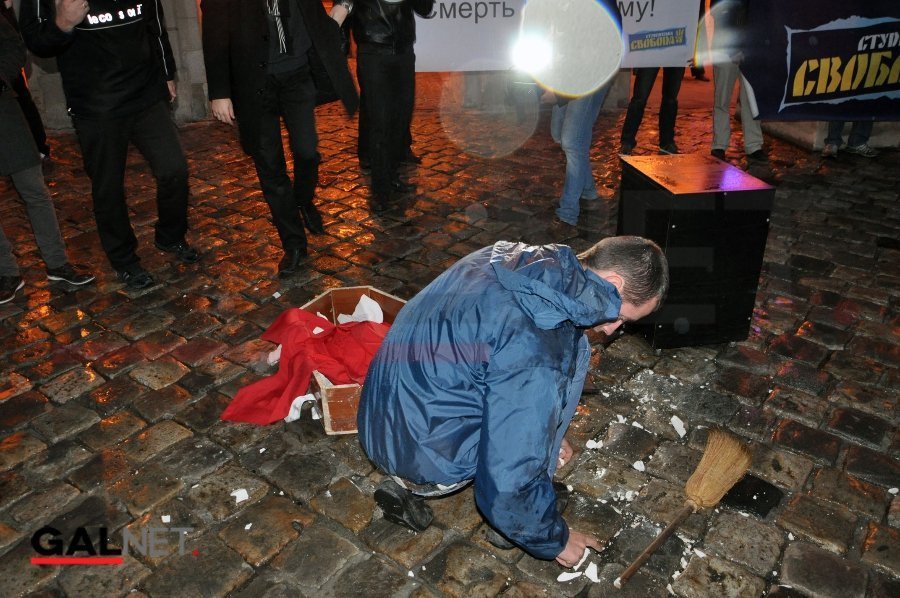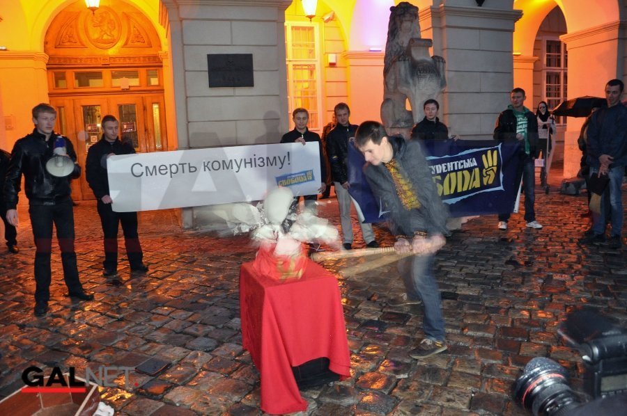 Під час цієї церемонії «студенти-свободівці» плювали на червоний комуністичний прапор, а «свободівці»-депутати Львівської міської ради стояли збоку і спостерігали за перфомансом.