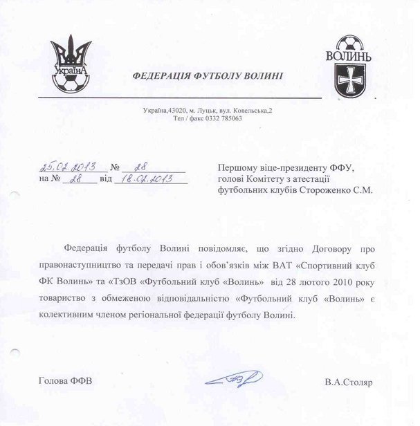 ФК «Волинь» маніпулює фактами, - Столяр. ДОКУМЕНТИ