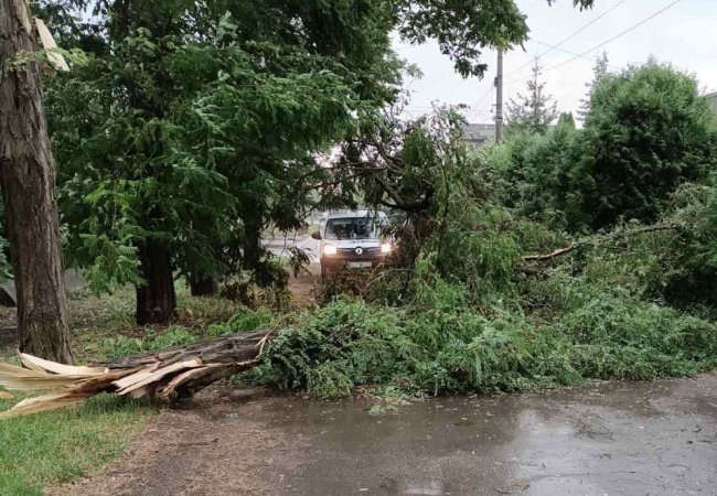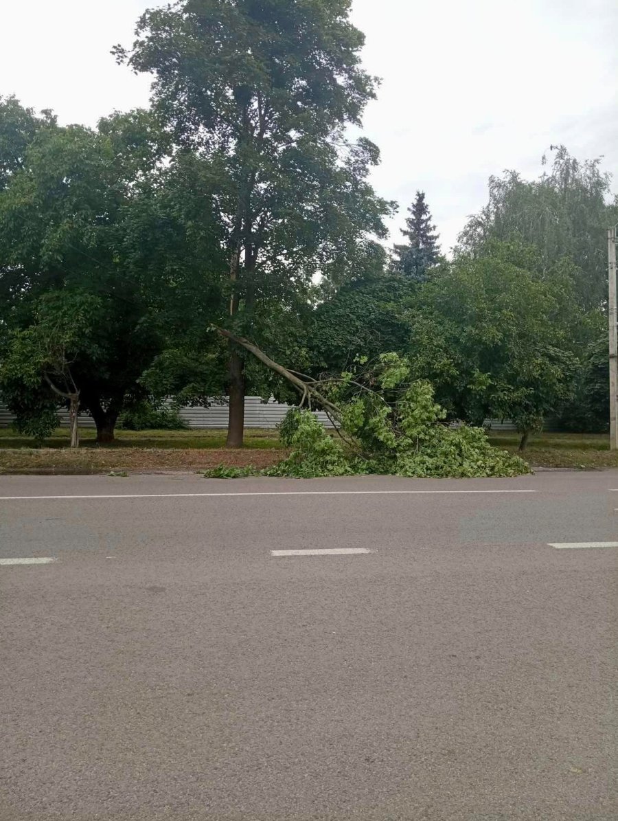 Пошкоджені дерева над трасою Р-15. Міський голова просить водіїв бути уважними та додає, що лінії електропередач не зазнали руйнувань.