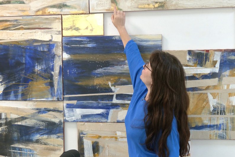Як розповіла Суспільному мисткиня, при створенні робіт використовувала будівельні матеріали та класичні художні техніки.