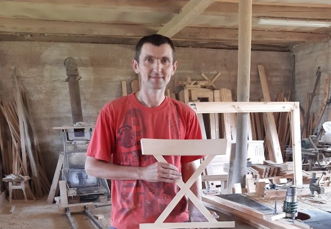 – Мені достатньо глянути на фото речі, і відразу розумію, що повинен робити, як та за чим. Ліжко, шафа, стіл – неважливо, побачив на картинці, відчув, що можу відтворити або створити унікальний зразок, і вперед, реалізувати задум. Для патинування краще підходить дуб, сосна навпаки – не годиться. Якщо фарбувати сосну, то через особливості її структури може вийти ефект якоїсь пластмасової речі. А вже лаками на водній основі не бажано покривати той же дуб, замучишся шліфувати, та й результат вийде кепський. Два дні приблизно йде на виготовлення крісла. Трохи довше – ліжка. Ціна меблів не набагато дорожча за фабричні, тобто виготовлені з тирсоплити. Але якість незрівнянно вища. Ці меблі створюють атмосферу затишку та гармонії в оселі, не шкідливі, будуть радувати своїх власників протягом десятиліть. У цьому вже переконалися мешканці всього району, міст і сіл України, звідкіля отримував замовлення. Доставляв і в Одесу, і в Київ, – мовить співрозмовник.
