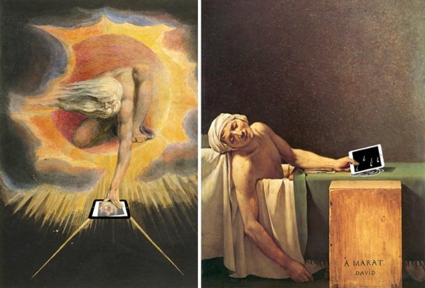 Зліва - Мультитач зум (за мотивами картини Давні дні Вільяма Блейка). Праворуч - Не беріть iPad у ванну (за мотивами картини Смерть Марата Жака Луї Давида)