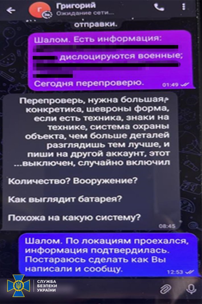 Комунікацію з воєнною розвідкою рф агент підтримував через анонімний чат у популярному месенджері, звідки видаляв всю інформацію після кожного сеансу зв’язку.