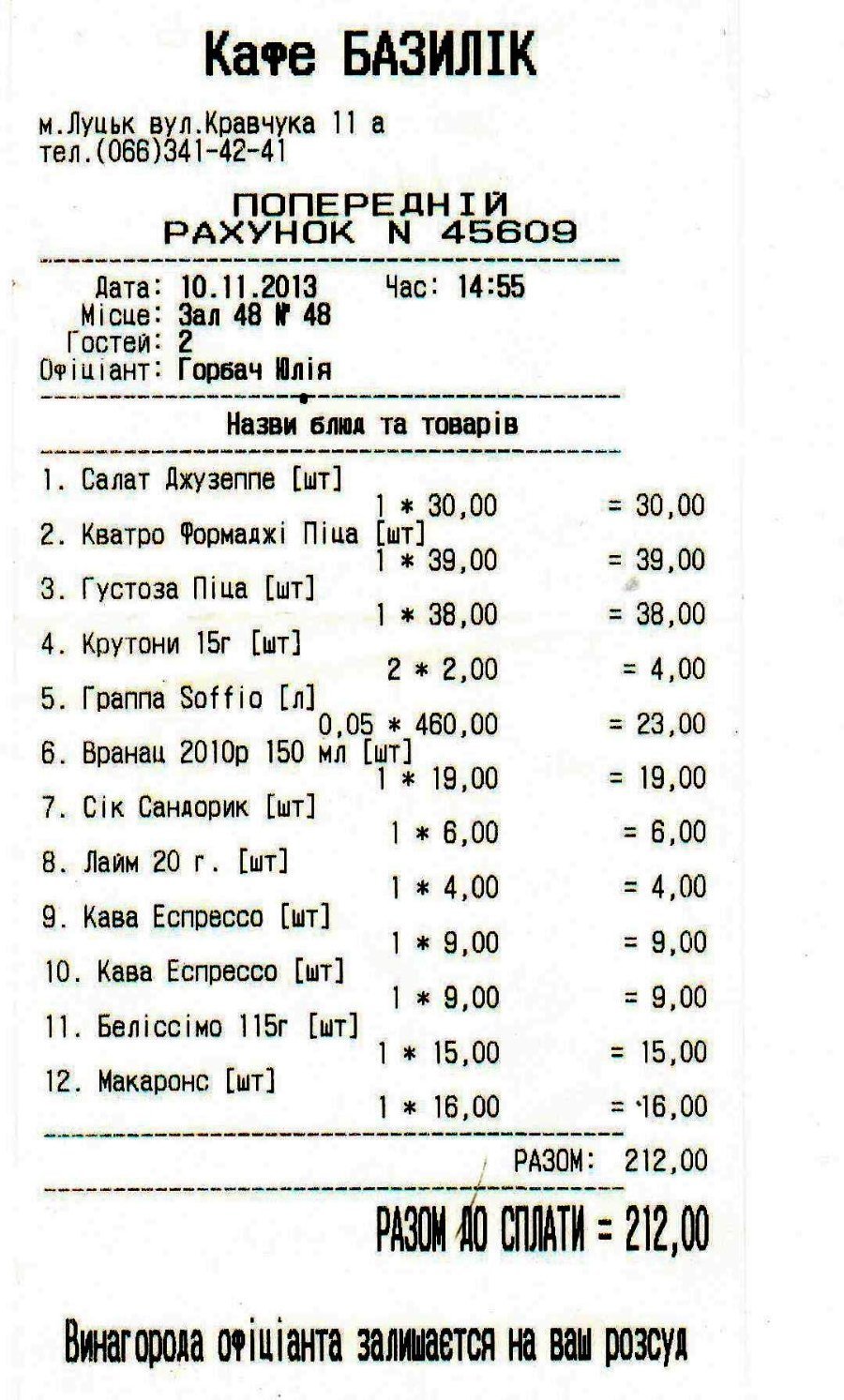 Просимо рахунок. Запитую, чи є система знижок, клубна карта, Q-карта. «Немає» - відповідає офіціантка Юля. До речі, їй похвала – обслуговувала нас уважно і гостинно.