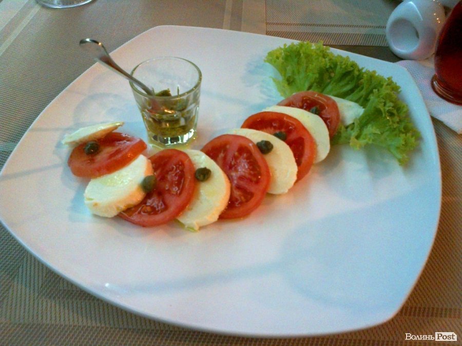 Салатний сюрприз: салат «Джузеппе» (моцарелла, томати конкасе, соус «Песто», листя салату, оливкова олія, базилік) виявився не зовсім схожим на себе, зате схожим на інший салат - «Капрезе». В справжньому салаті «Джузеппе» повинні бути баклажани. А ще тут мусять бути саме томати конкасе – себто помідори, нарізані кубиками. Тепер уважно гляньте на фото