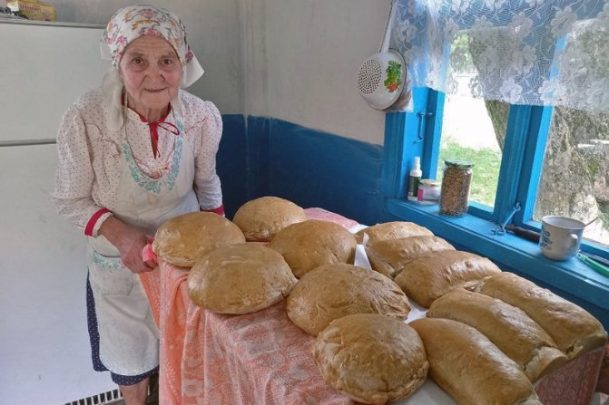 Спершу замішує тісто для хліба — цей процес триває півтори години. Зі слів пенсіонерки, на 12 буханців хліба використовує орієнтовно відро борошна. "В хатах не люблю прибирати, а хліб люблю пекти і в городі цюкати. Ото моє хобі", — розповідає пенсіонерка.