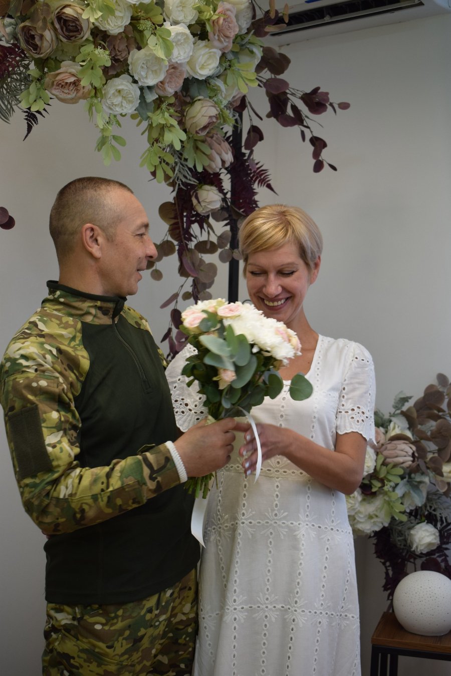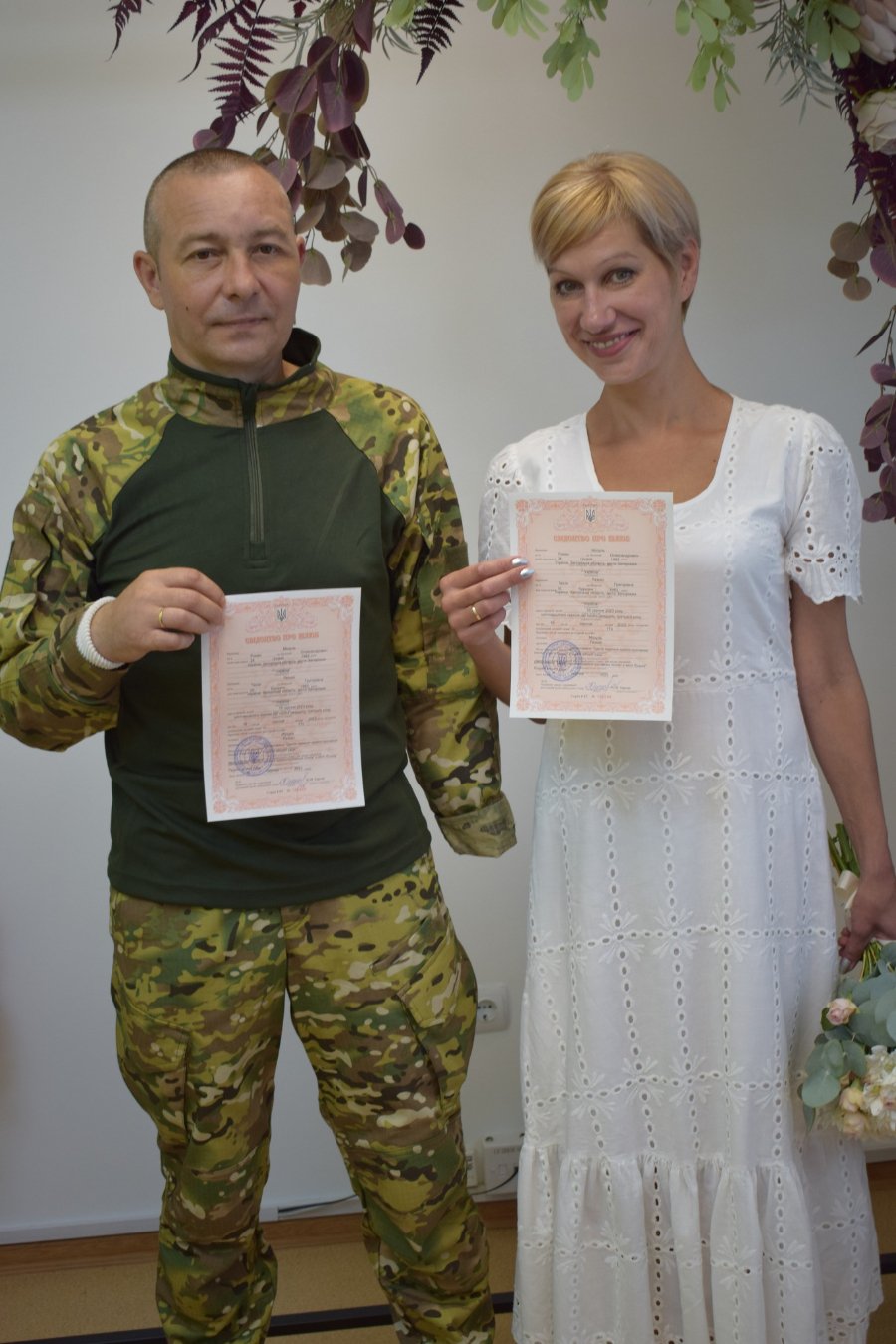 "У поглядах цієї пари - і біль від пережитого, і море хвилювань, та найбільше - любові й ніжності один до одного. Сердечно бажаємо молодятам не втрачати оптимізму і надії, спокою та витривалості у важкий для кожного час. Хай спільна життєва стежина тривало веде вас у добрі, коханні, розумінні! А ми щиро вдячні нашому захиснику за можливість жити і працювати! Його ціна - втрачене здоров’я і спокій. Хай відновиться сила, додасться енергія, збережеться запал впевнено йти до Перемоги", - йдеться в повідомленні.