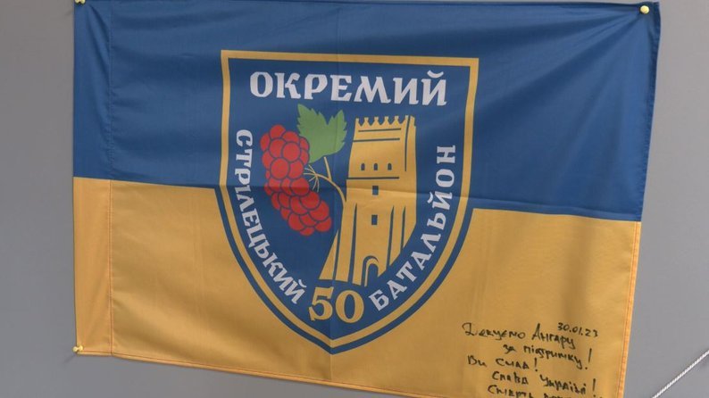 У волонтерському штабі "Ангар" за півтора року діяльності назбиралося орієнтовно пів сотні прапорів від військових зі словами вдячності та підписами. Ці державні стяги прикрашають стіни волонтерського осередку.