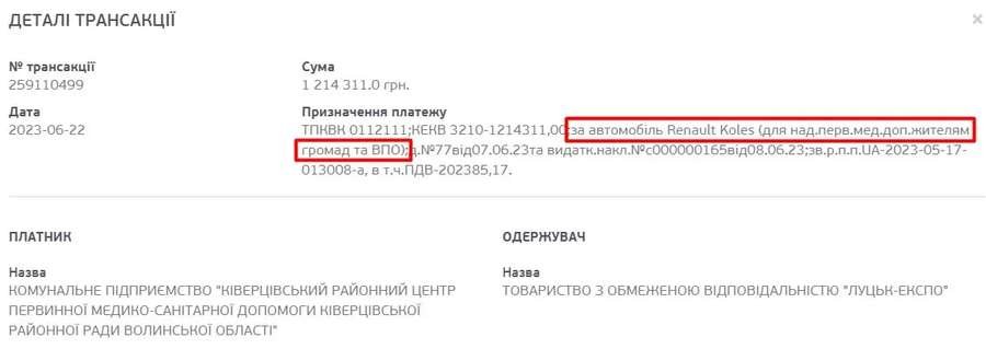 Більше того, зі слів Сергія Рижкова, він зафіксував мера Ківерців на автомобілі «Renault Koleos» 2022 року випуску – новенькому кросовері, який лише два місяці тому придбала місцева поліклініка – Центр первинної медичної допомоги. За автівку віддали 1,214 мільйона гривень з обґрунтуванням: для надання первинної медичної допомоги жителям громад та внутрішньо переміщеним особам.