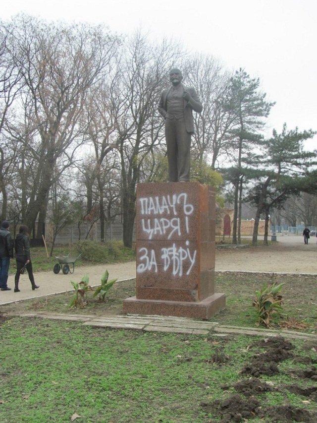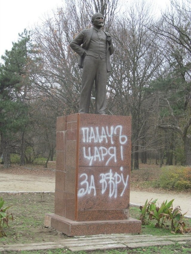 Крім того, на п'єдесталі з'явилися написи, зроблені рукою невідомого: "Палачъ царя!За вѣру!". Комуністи вже готують за цим актом вандалізму звернення до міліції. Щоправда, про підозрюваних поки не говорять.