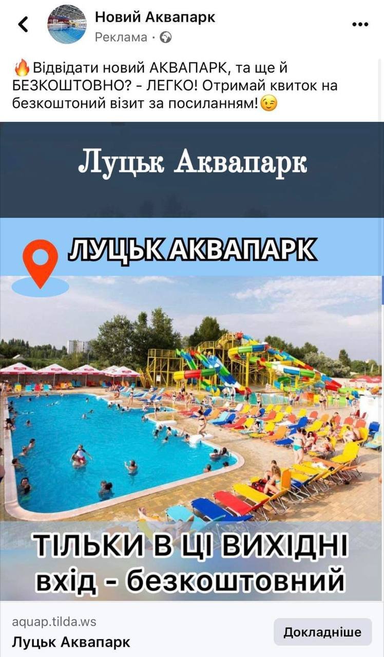Цей приклад від інших відрізняється лише форматом. Фейкомети вирішили створити сторінку аквапарку у Луцьку, якого, як ви здогадались, не існує. Також виявилось, що рекламу з фейковими аквапарками просувають у багатьох містах України.