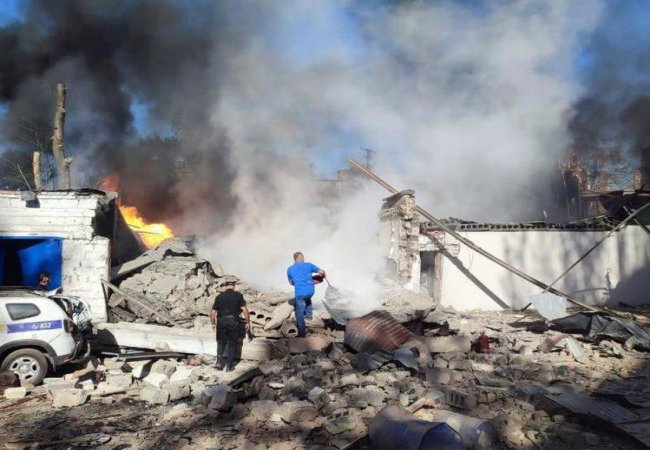 Надзвичайники на місці прильоту гасять пожежу площею 200 квадратних метрів.
