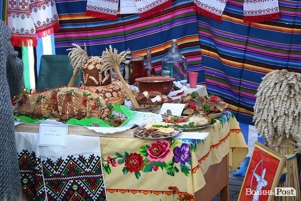 На майдані розкладені стенди, де представляють райони області та продукцію, яку там виробляють. Це і вирощені овочі, спечені ковбаси, хлібна та медові вироби.