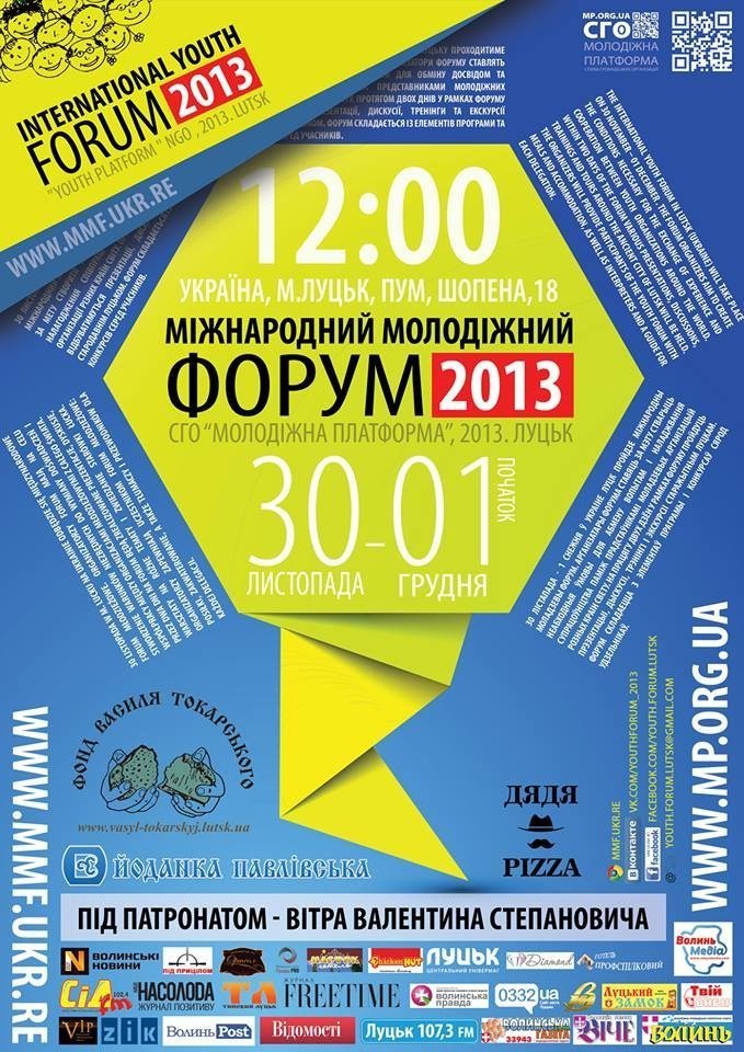 Захід відбудеться під патронатом заступника голови волинської обласної ради – Валентина Вітра. Партнерами форуму є: фонд Василя Токарського, сімейне кафе «Дядя Pizza» та «Йоданка Павлівська».