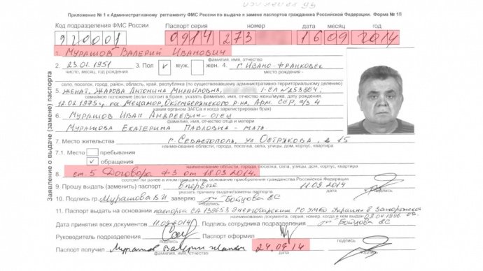 В одній з таких поїздок він став громадянином росії. Ця подія датована 23 вересня 2014 року. Журналісти від двох джерел отримали витяг про "роспаспорт" Мурашова з автоматизованої системи.