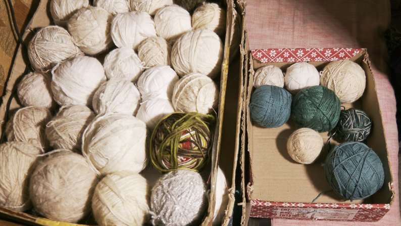 Здебільшого Валентина Мазурик в’яже рябі рукавиці для повноцінного маскування військових, а сортувати кольори їй допомагають соціальні працівники. Всього, каже, має сім коробок по сім мотків ниток різних кольорів.